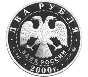 Аверс: в центре диска — эмблема Банка России (двуглавый орёл художника И. Билибина, под ним надпись полукругом «БАНК РОССИИ»), обрамлённая кругом из точек и надписями по кругу: вверху — «ДВА РУБЛЯ», внизу — «2000 г.», слева — обозначение металла, проба сплава, справа — содержание драгоценного металла в чистоте и товарный знак монетного двора.