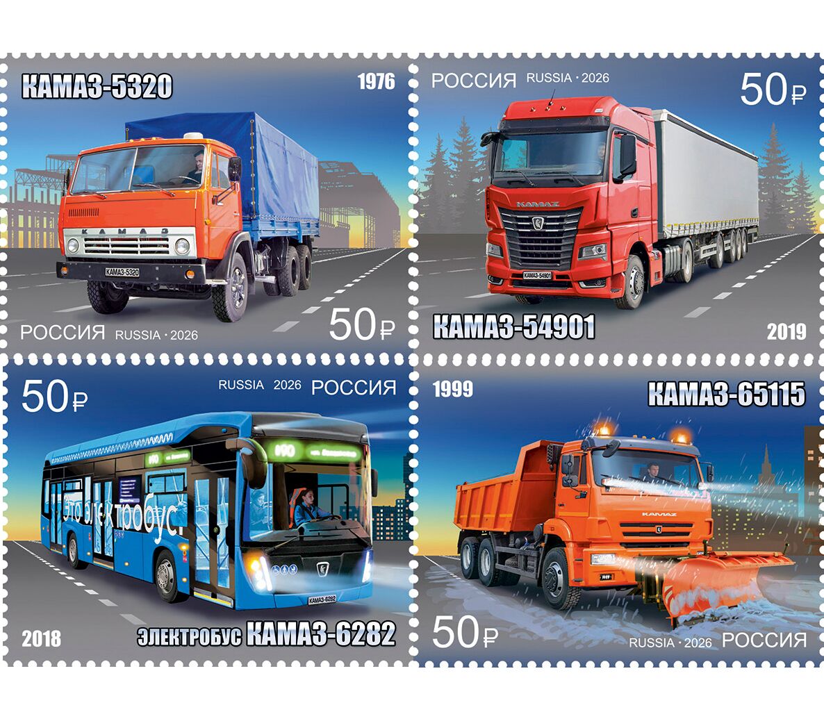 4 почтовые марки «50 лет первому грузовому автомобилю КамАЗ» 2026
