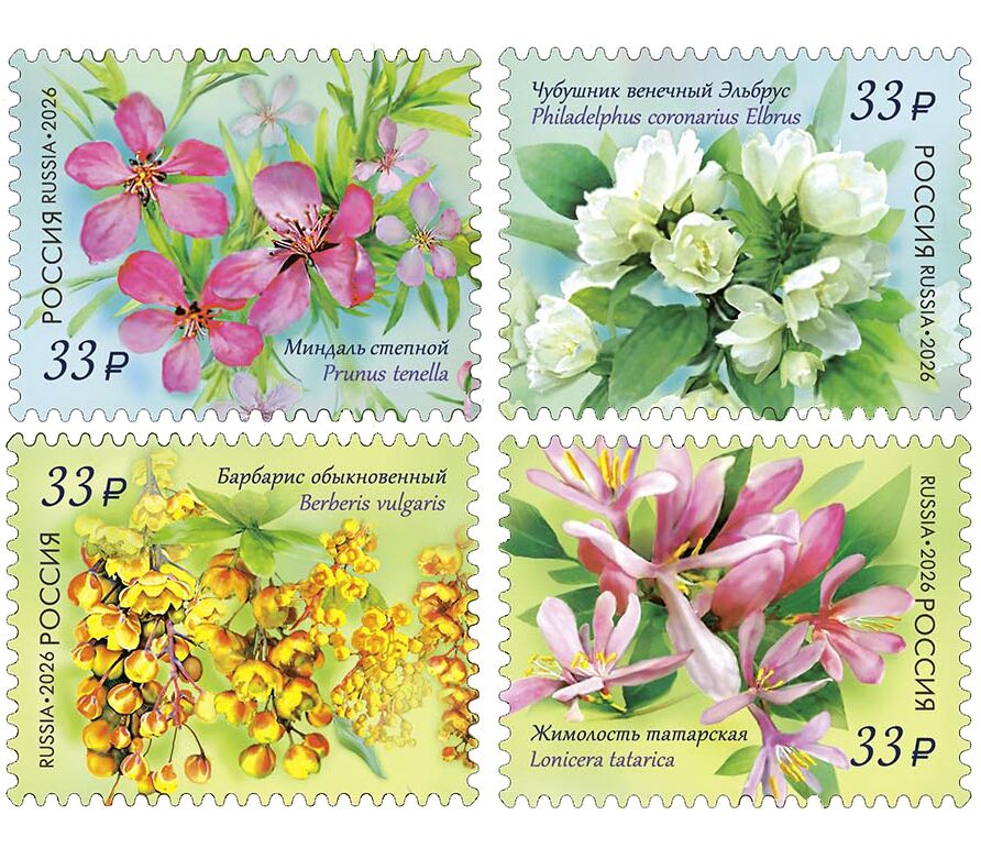 Новый выпуск почтовых марок в рамках серии «Флора России». На марках изображены декоративные кустарники:
