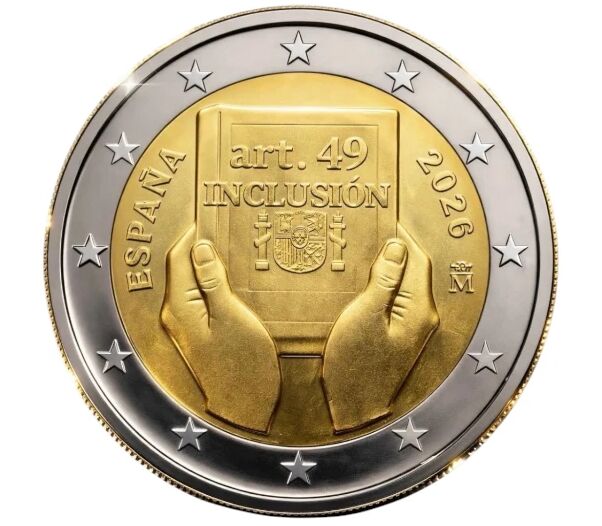 Памятная монета номиналом 2 евро, выпущенная в Испании в 2026 году, посвящена статье 49 Конституции, гарантирующей инклюзивность и права людей с инвалидностью.